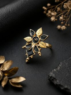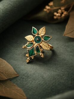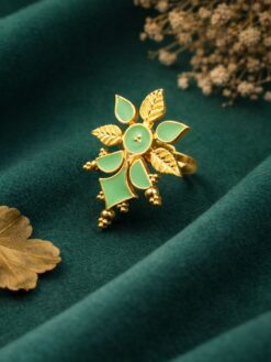 The _Meenakari Floral Ring is crafted using high-quality brass, ensuring strength and long-lasting shine. The detailed _Meenakari enamel work is carefully applied by skilled artisans, highlighting the floral motifs with precision. The premium polish enhances its luxurious appeal, while the smooth finish ensures a comfortable fit for extended wear.