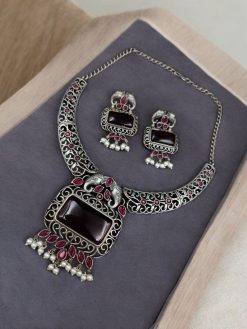 Antique-Style Oxidized Silver Nandi Necklace with Monalisa Stone – Best Traditional Outfits