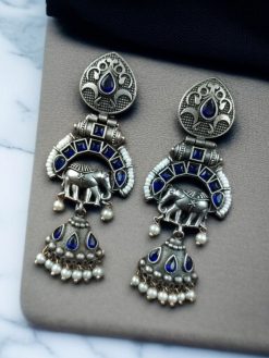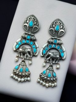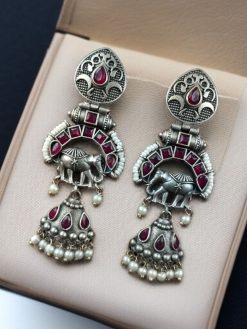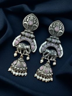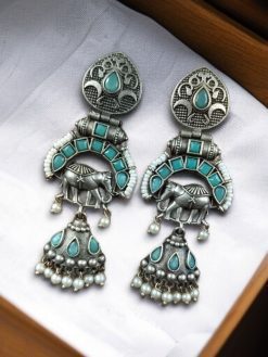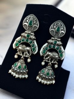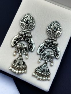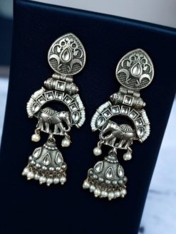 Crafted in premium-quality oxidized silver replica, the earrings showcase a beautifully carved elephant motif perched atop a classic jhumki bell design. The antique finish gives them a rich, vintage appeal, while the detailed engravings enhance their traditional essence. Each curve of the elephant and every element of the jhumki reflects skilled craftsmanship, making these Elephant Jhumki Earrings a standout piece in any jewelry collection.