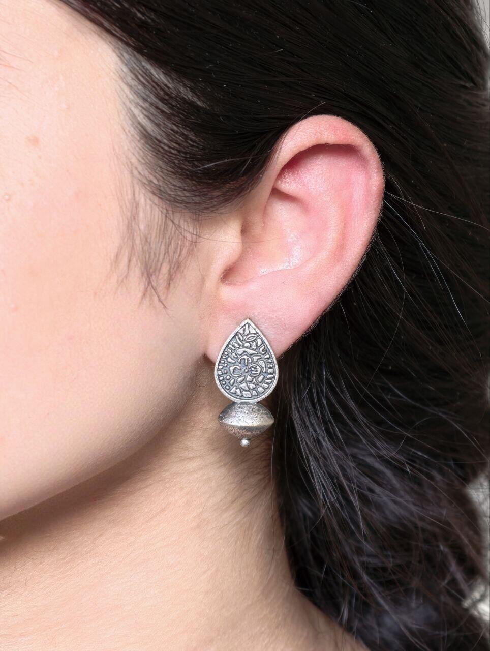 Featuring intricate patterns inspired by vintage artistry, these stud earrings mimic the classic beauty of antique silver jewelry. The oxidized finish enhances their traditional look, making them a standout accessory for any occasion. Whether paired with casual outfits or ethnic ensembles, these earrings add a subtle yet stylish flair to your appearance.