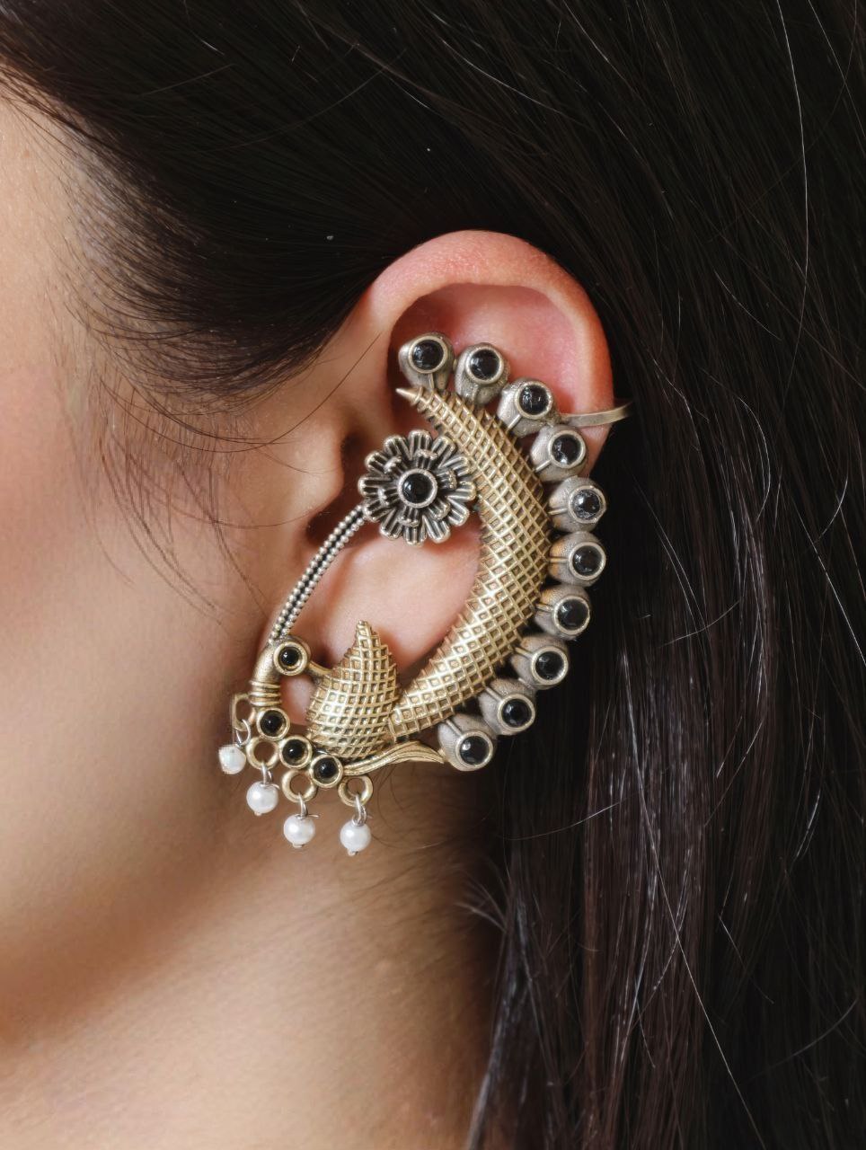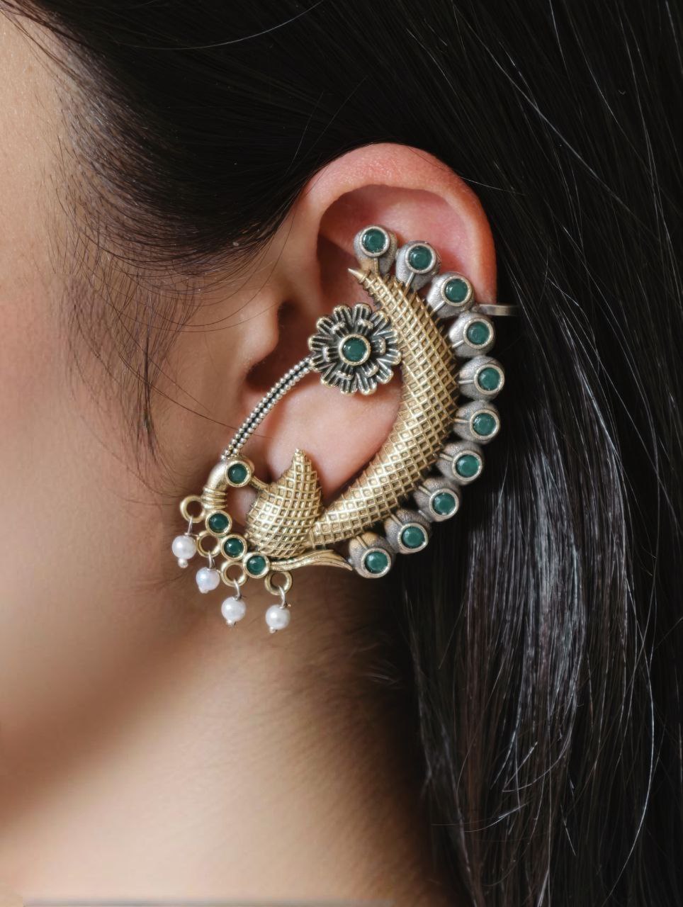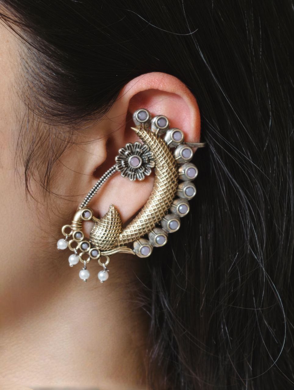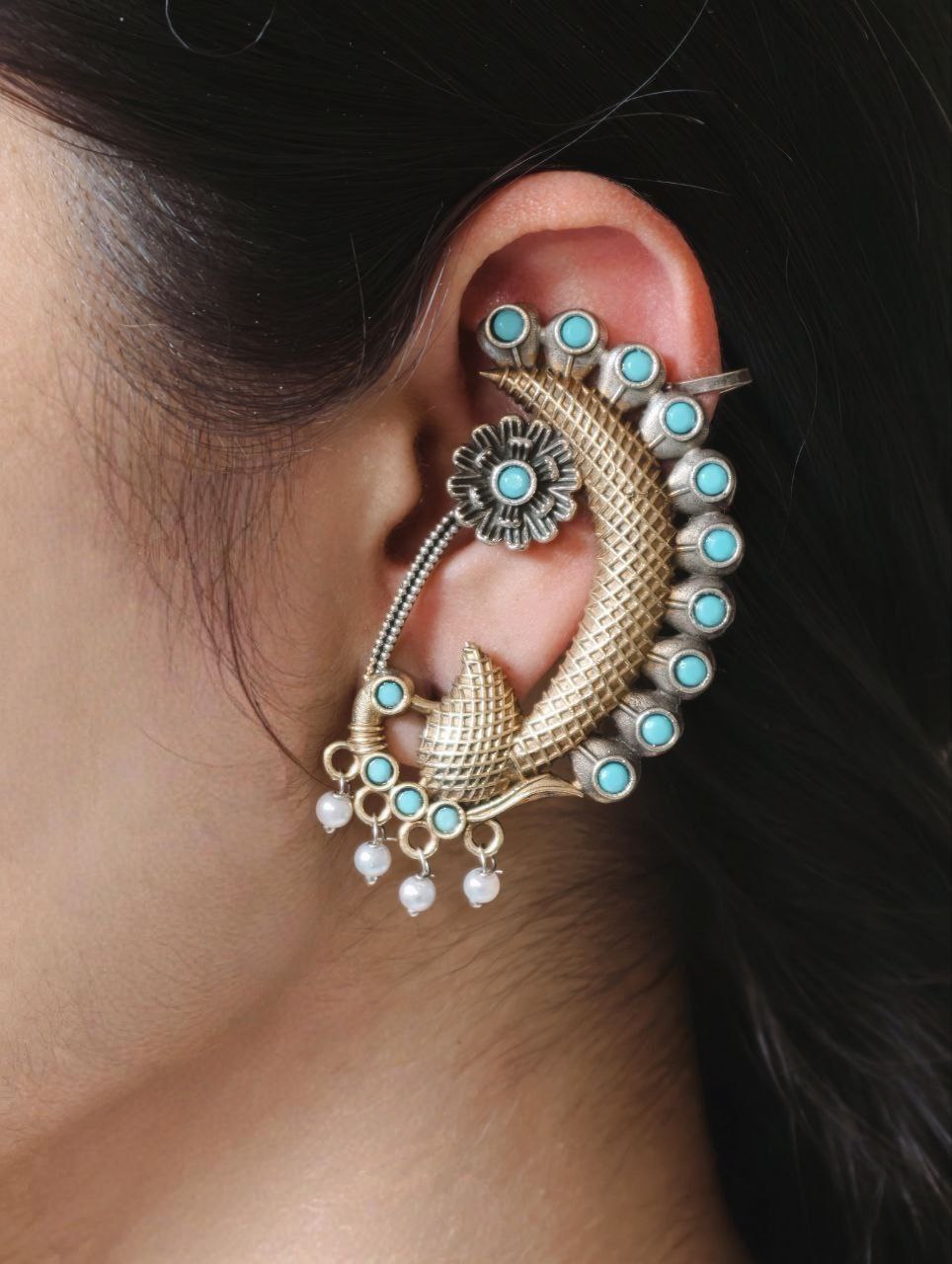 This peacock earcuff pairs beautifully with sarees, lehengas, anarkalis, and ethnic suits. It also complements fusion outfits, allowing you to style it for both traditional and modern looks. The two-tone finish blends effortlessly with gold and silver jewelry, making it easy to mix and match with other accessories.