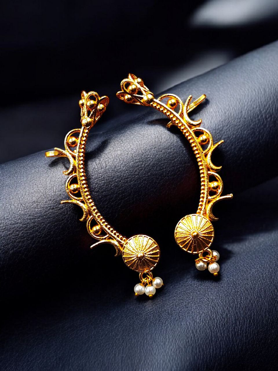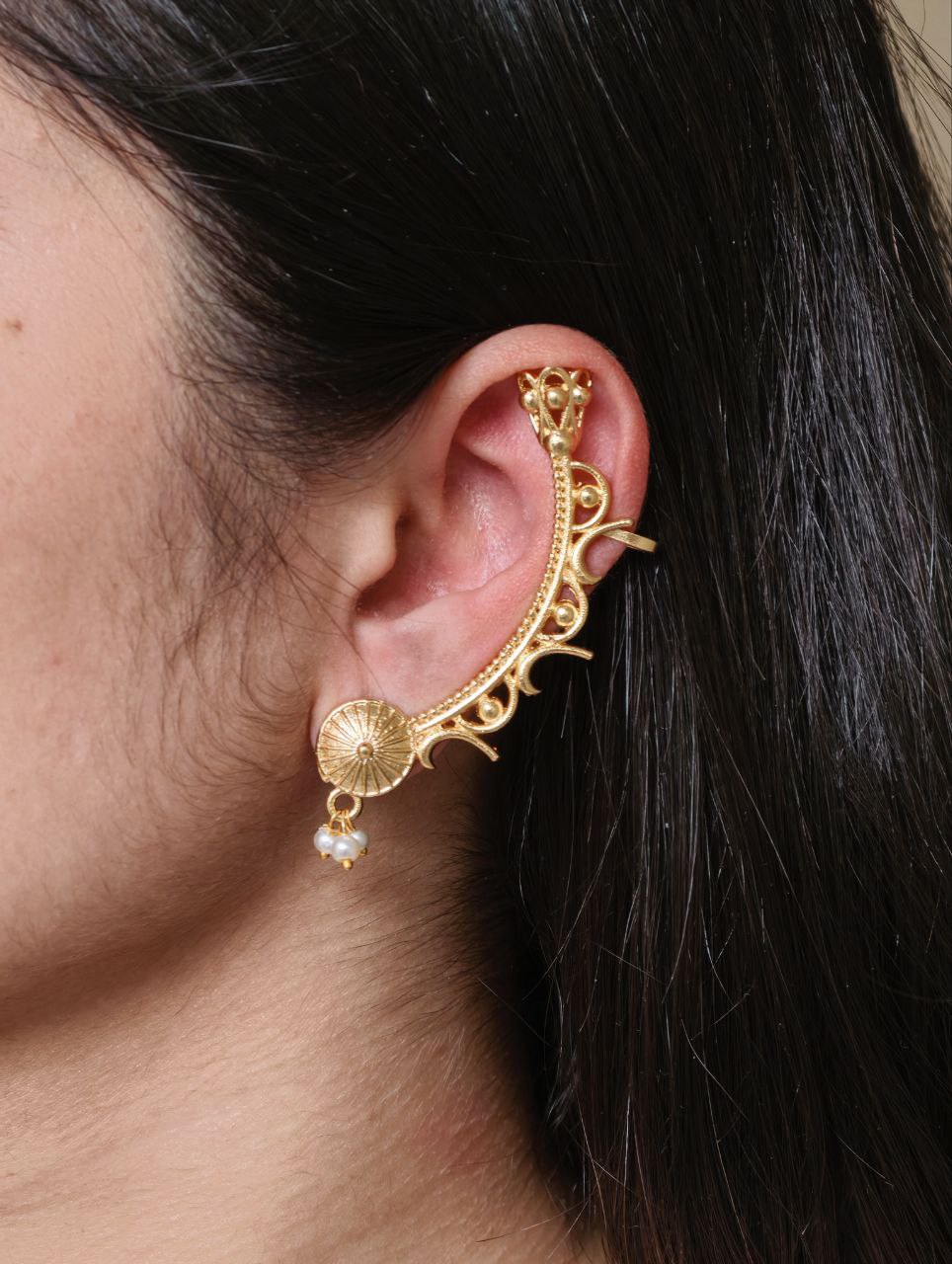 Crafted using high-quality base metal, this earcuff is finished with premium gold plating that gives it a rich, radiant shine. The detailed pearl work adds a soft and graceful charm, creating a beautiful contrast against the warm gold tone. Each pearl is carefully placed to ensure a balanced and refined appearance, highlighting the intricate ethnic design.