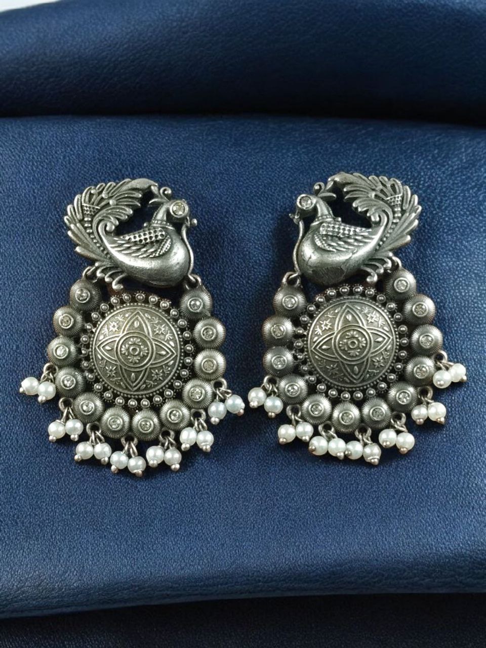 The earrings are adorned with delicate pearl detailing that adds a soft, luxurious touch. The pearls beautifully complement the oxidized silver tone, creating a balanced fusion of classic and ethnic aesthetics. Whether you’re dressing up for festive occasions, cultural events, or casual outings, these earrings will effortlessly elevate your look with their unique artistry and traditional appeal.