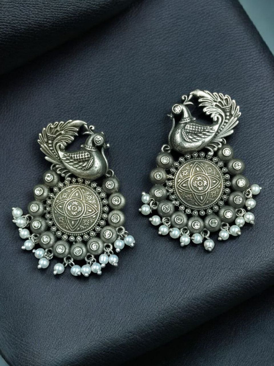 Crafted with precision by skilled artisans, these oxidized silver replica earrings combine durability with lightweight comfort, making them suitable for long wear. The bird design captures intricate patterns and textures, showcasing the craftsmanship that makes each pair truly unique. Their antique look ensures they pair beautifully with sarees, kurtis, or Indo-western outfits, allowing you to embrace versatility without compromising style.