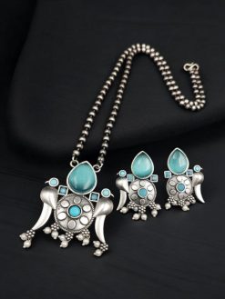 The centerpiece of this Brass Necklace is the exquisite bird-inspired design, intricately crafted in premium-quality brass for a timeless and durable finish. Adorned with captivating Monalisa stones, the necklace radiates an unmatched charm and brilliance. The stones’ shimmering appeal perfectly complements the ethnic bird motif, creating a piece that celebrates both nature an Brass Necklace is paired with matching earrings, completing the set and ensuring a cohesive, elegant look. Whether you’re attending a wedding, festival, or special event, this jewelry set adds a sophisticated touch to your outfit. Designed to pair beautifully with sarees, lehengas, and ethnic gowns, this set promises to be a versatile addition to your jewelry collection.