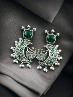 Handcrafted Silver Look-Alike Dancing Girl Earrings with Floral Moon, Monalisa Stone, and Pearl Detailing in an elegant oxidized finish.