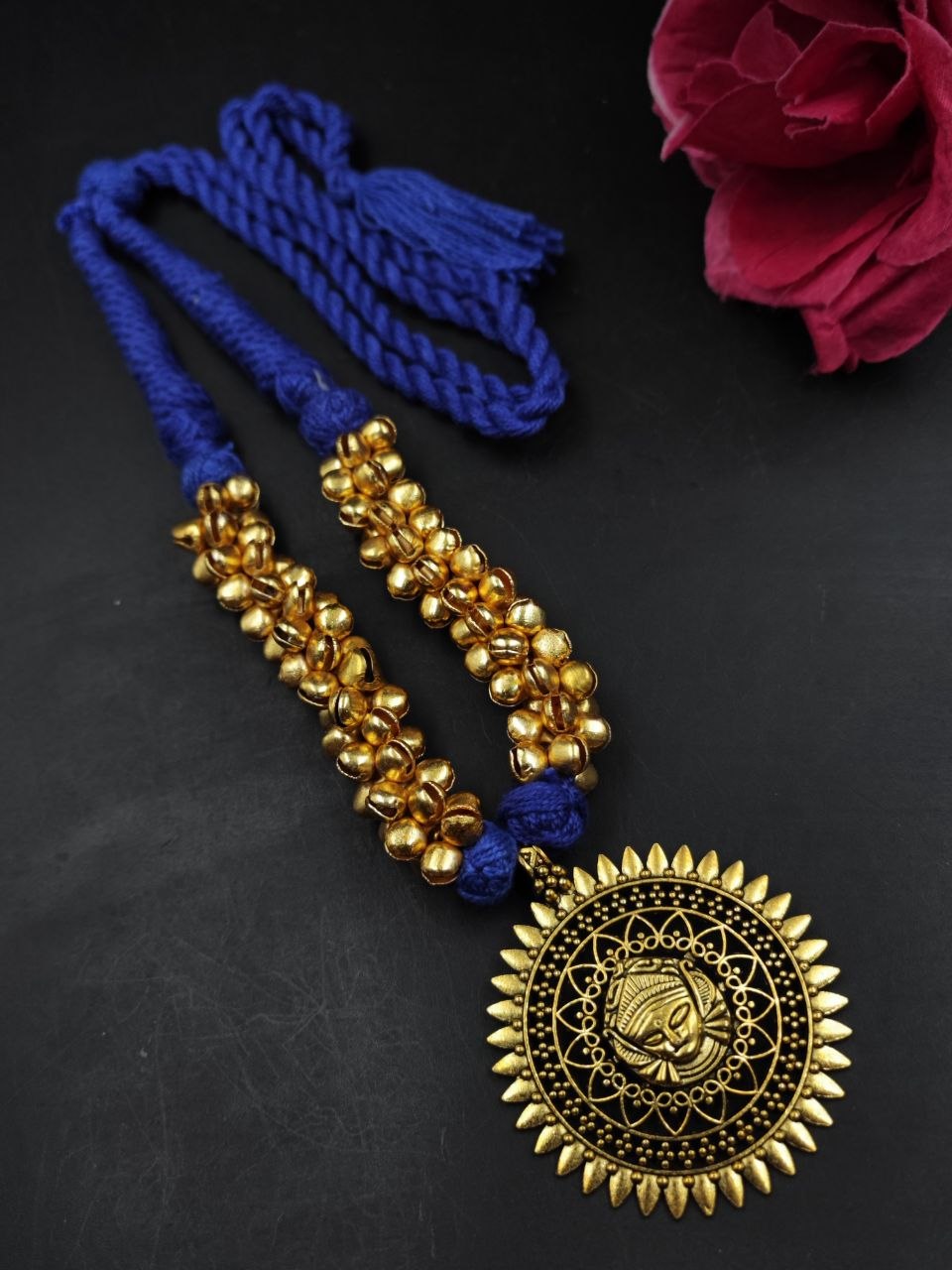 The Thread Necklace showcases detailed artistry with finely woven threads combined with a sturdy brass base. The premium polish enhances its shine and protects it from wear and tear, ensuring long-lasting beauty. Each element is carefully designed to maintain balance between traditional aesthetics and modern appeal, making it suitable for multiple occasions.