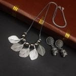 Introducing our exquisite Oxidised German Silver Chain Leaf Necklace with Jhumka Earrings, a perfect blend of elegance and traditional charm. This stunning Oxidised Necklace jewelry set is designed to enhance your beauty and add a touch of sophistication to any ensemble.