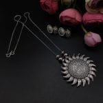 The necklace features a delicate chain made of oxidized German silver, known for its antique appearance and durability. The chain is adorned with intricately designed motifs and beads, adding a captivating allure to the piece. It sits gracefully around your neck, enhancing your neckline and making a bold style statement.