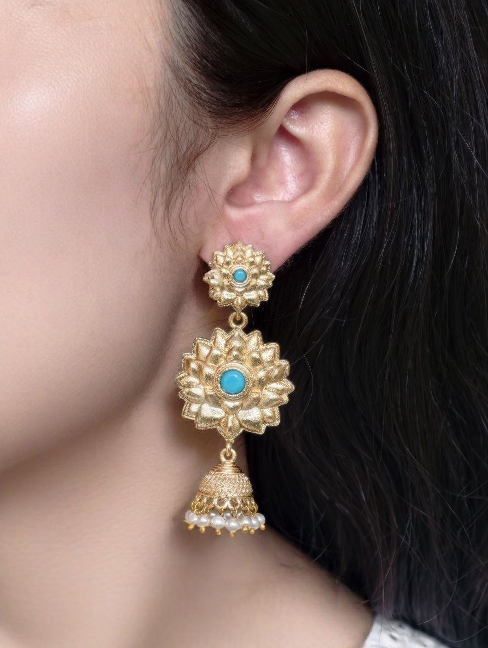 Add timeless elegance to your ethnic jewelry collection with the Elegant Gold Plated Flower Design Jhumka Earrings, beautifully crafted with intricate stone and pearl work. Inspired by traditional Indian floral motifs, these jhumka earrings reflect graceful craftsmanship and classic beauty, making them a perfect choice for women who love rich yet elegant jewelry.