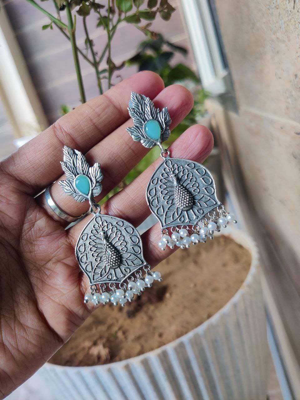 Elegant Peacock Design Earrings | Silver Replica Oxidized Jewelry for Women and Girls in Traditional Festive Wear