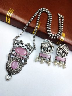 Completing the set are the matching earrings, designed to harmonize effortlessly with the pendant. Crafted with the same attention to detail and precision, the earrings mirror the enchanting allure of the pendant, creating a cohesive and captivating look that is sure to turn heads. Whether worn as a statement piece for special occasions or as an everyday accessory to elevate your ensemble, our Elephant Chain Pendant Set with Monalisa Stone promises to be a versatile addition to your jewelry collection. Each piece is a testament to the skill and dedication of our artisans, ensuring that you not only wear a piece of jewelry but also a work of art that reflects your unique style and personality.