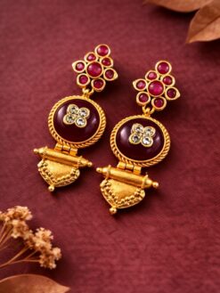 The Ethnic Gold Plated Earring is crafted using high-quality brass, ensuring strength and long-lasting shine. The detailed design showcases traditional artistry, while the premium gold polish enhances its luxurious finish. Each piece is carefully designed to provide a smooth and comfortable fit, making it suitable for extended wear.