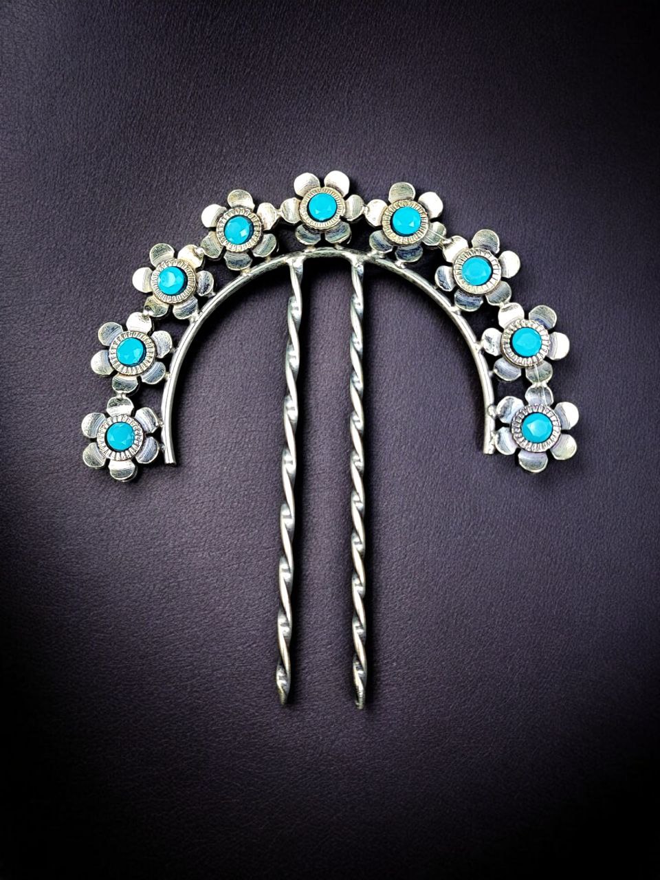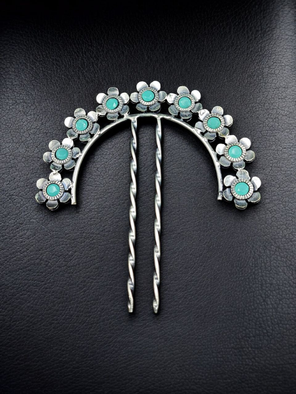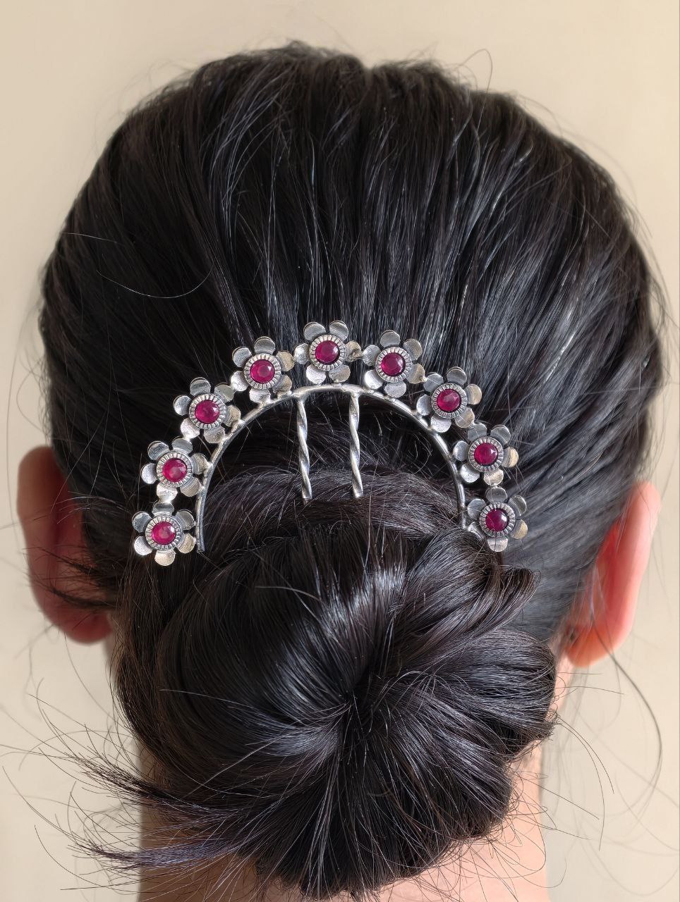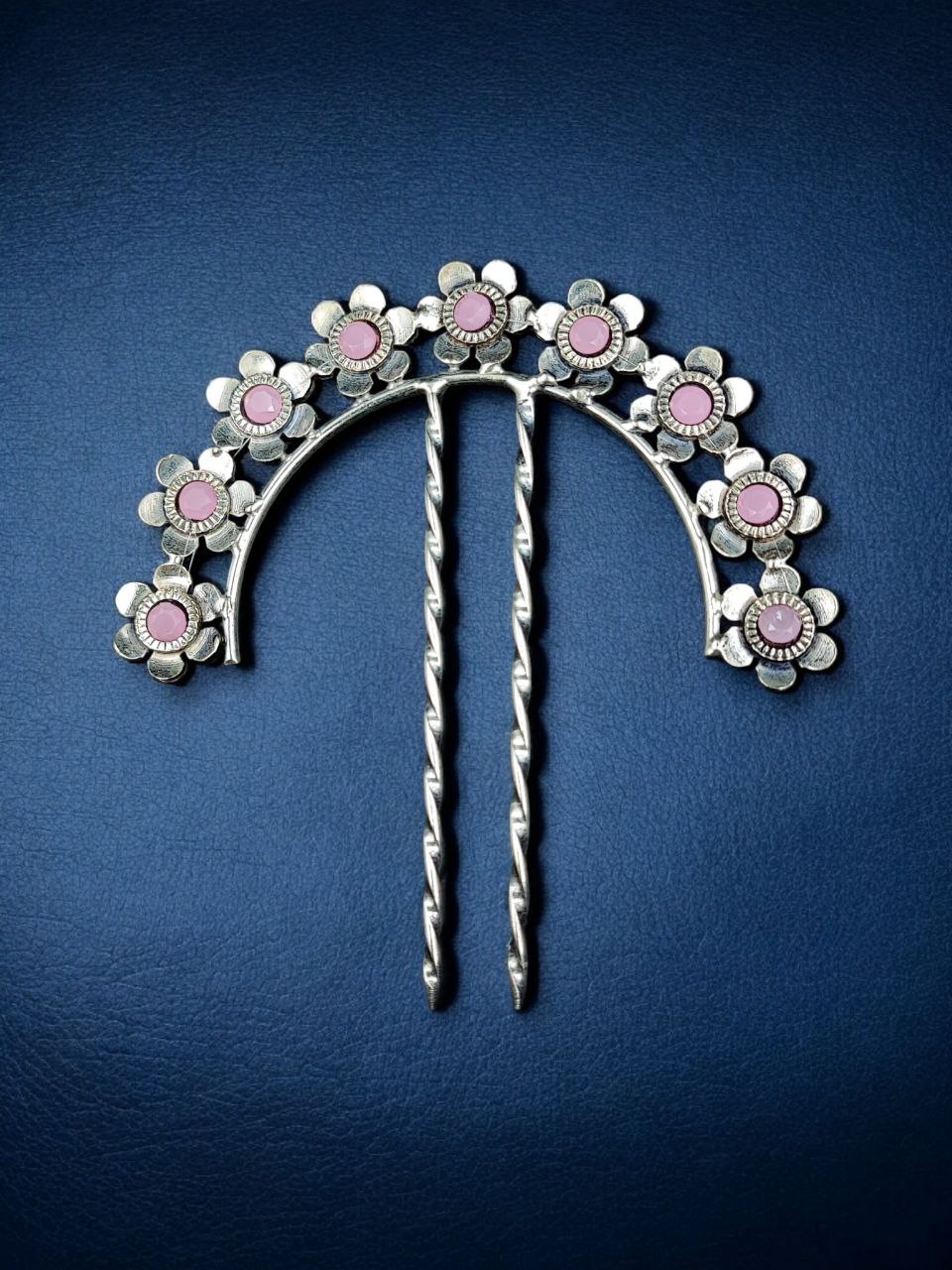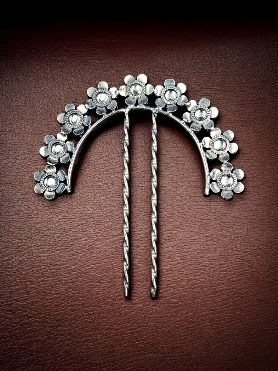 Crafted from high-quality base metal, this Flower Bun Stick is finished with premium silver plating that gives it a radiant shine and long-lasting durability. The flower design is intricately detailed to highlight artistic craftsmanship, while the carefully placed stone work adds a subtle shimmer that enhances its overall appeal. Each element is thoughtfully designed to create a balanced and elegant look.