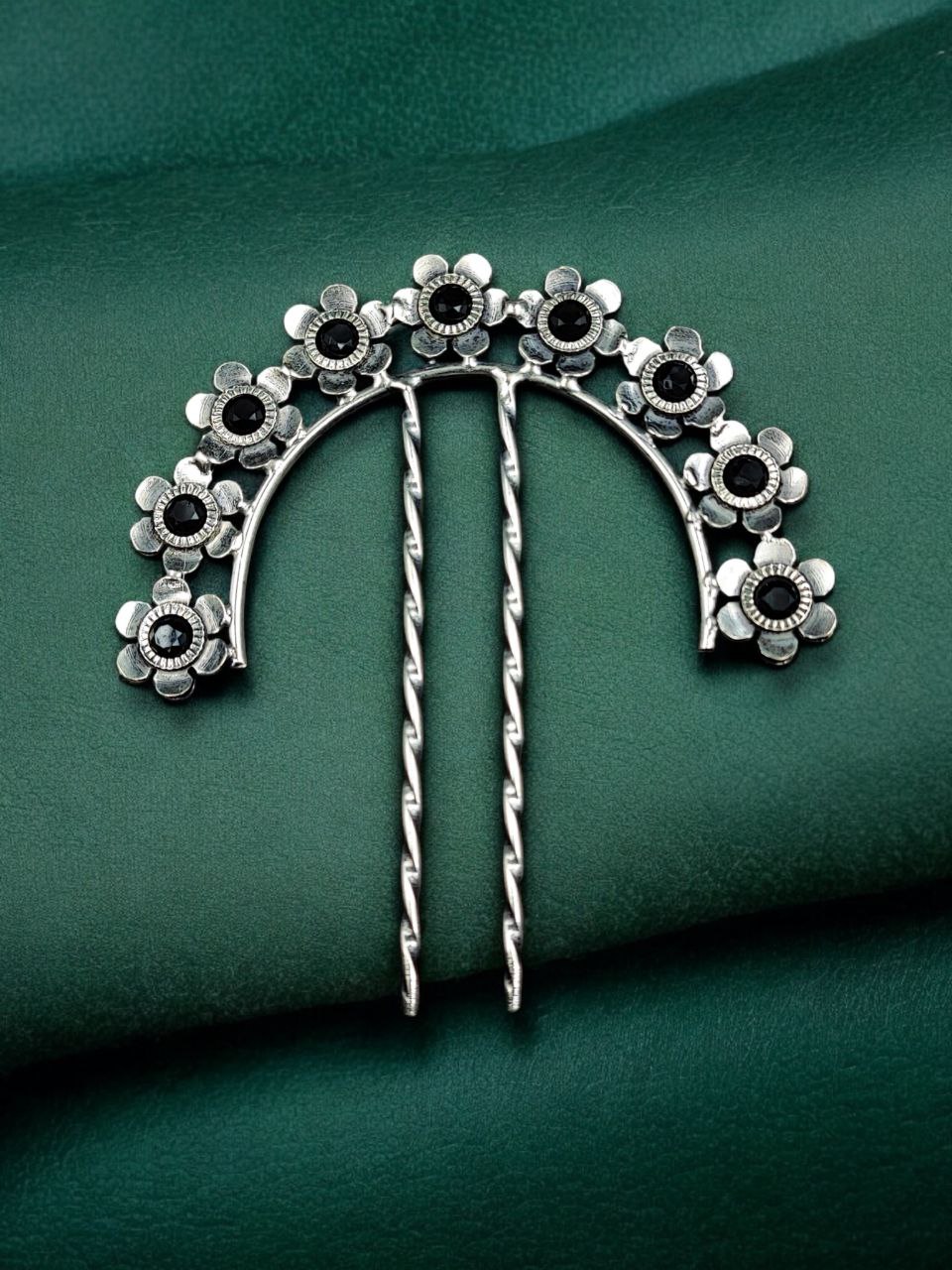 Enhance your traditional hairstyle with the elegance of the Ethnic Silver Plated Flower Bun Stick, a beautifully crafted hair accessory designed with delicate stone work and inspired by classic floral motifs. This bun stick reflects timeless Indian artistry and adds a graceful charm to your hair, making it perfect for women who love traditional beauty with a touch of sparkle.