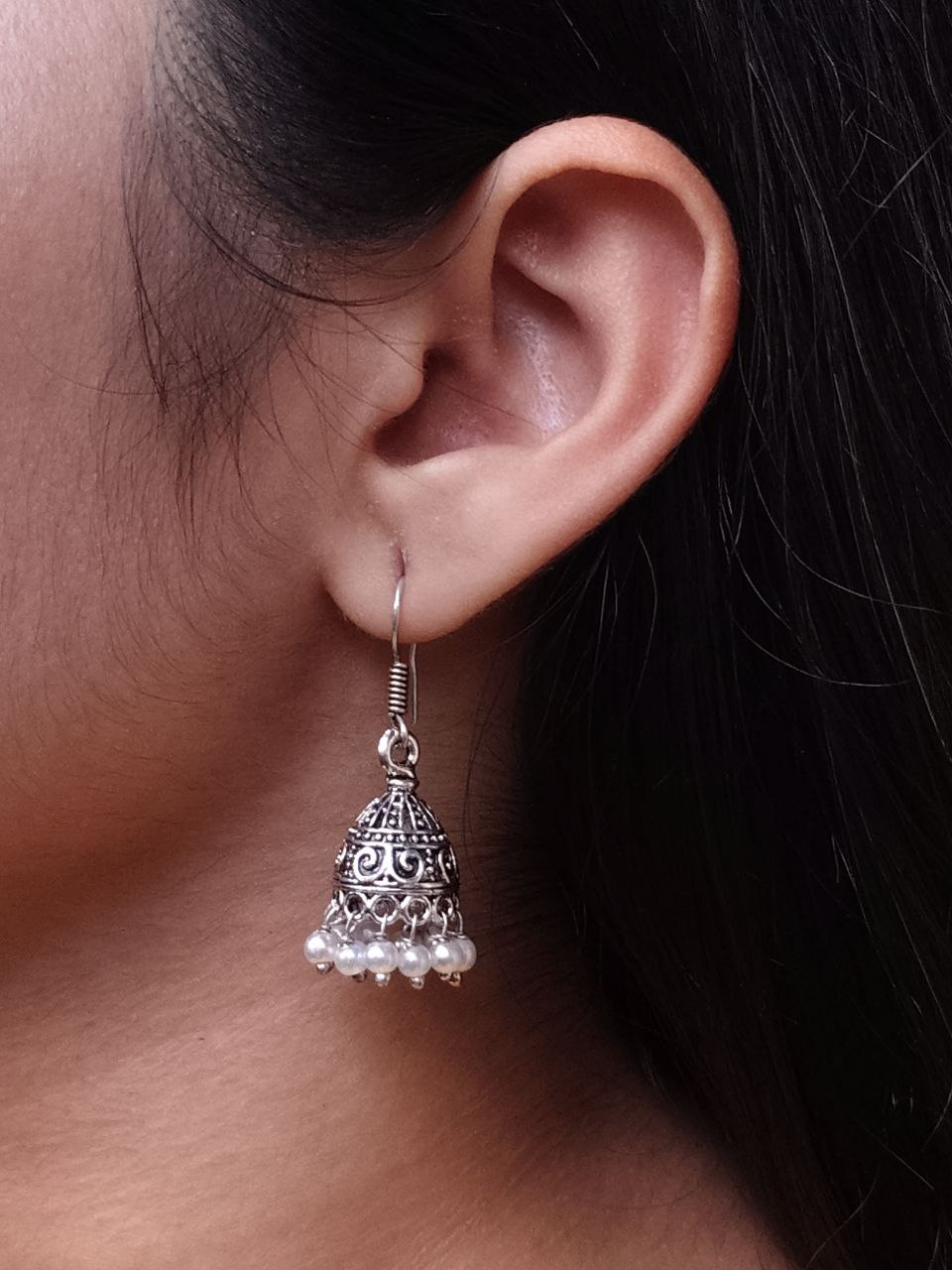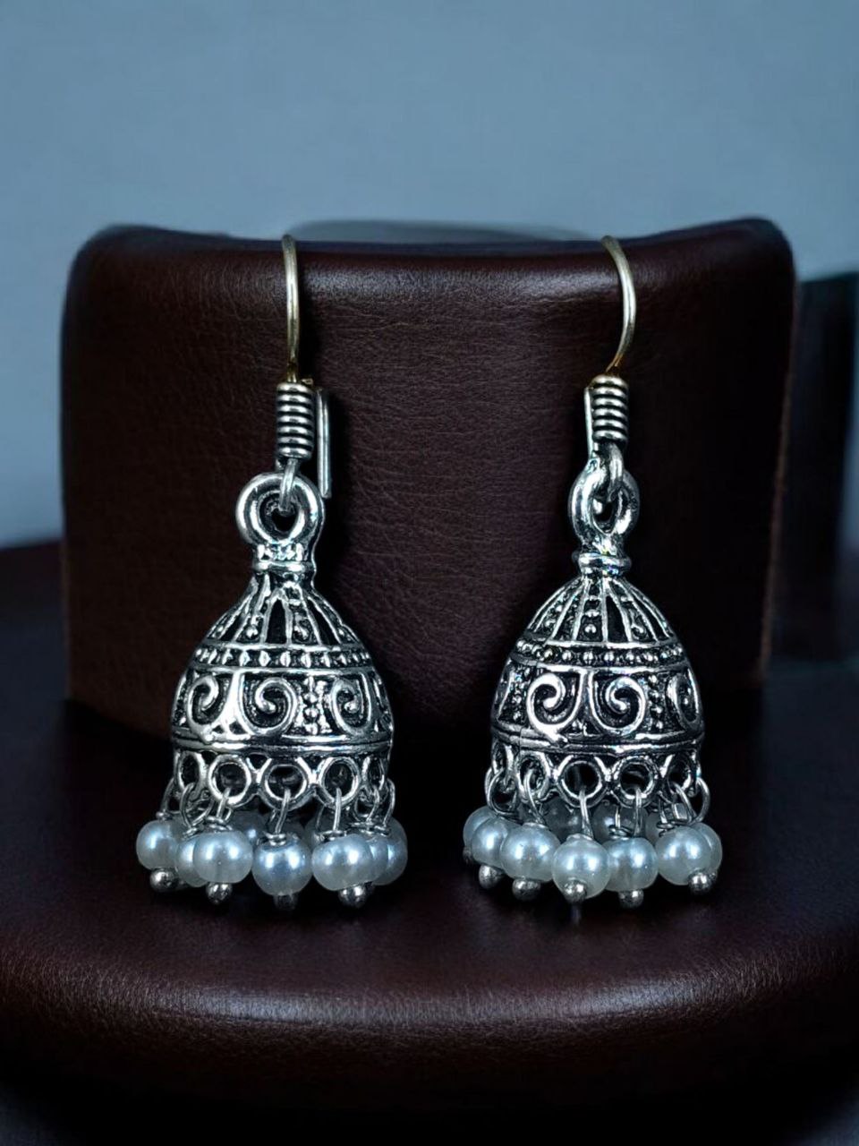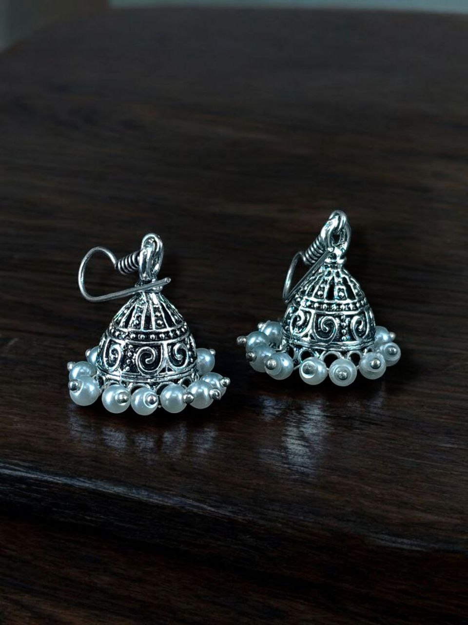 The design showcases intricate floral art detailing that highlights the craftsmanship and cultural richness of Indian jewelry. The delicate arrangement of pearls enhances the beauty of the oxidized silver finish, creating a stunning contrast that makes these Floral Art Jhumki Earrings stand out. Lightweight yet durable, these jhumkis ensure comfort throughout the day, making them ideal for long wear.