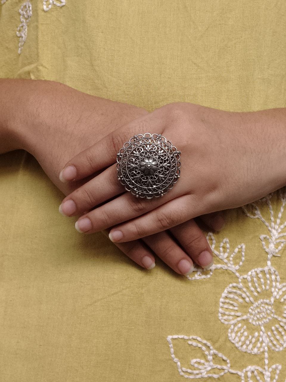 Crafted with premium silver replica plating, the ring features a stunning oxidized finish that enhances its vintage appeal. The delicate floral art design adds a soft feminine touch, beautifully representing natural beauty and grace. Intricately carved petals and fine detailing reflect expert craftsmanship, offering a refined look that suits all ages and personal styles.