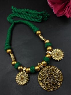 The Floral Art Thread Necklace is crafted using high-quality brass with intricate floral motifs and detailed thread work. The oxidized-style finishing gives it a vintage-inspired look, while the thread elements add a modern and comfortable touch. Each piece is carefully finished to ensure durability and resistance to fading, making it a long-lasting addition to your jewelry collection.