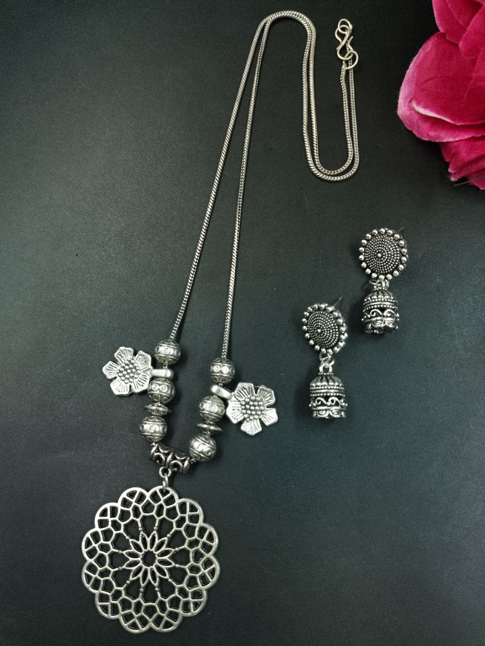 Flower Charm German Silver Chain Pendant Necklace Set for Women Traditional Ethnic Jewelry
