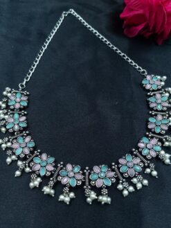 Made with a premium silver-plated finish, the choker showcases durability along with a regal shine. The pearls lend a touch of sophistication, while the stone embellishments provide a dazzling sparkle that draws attention instantly. Whether paired with a bridal lehenga, festive saree, or even an Indo-western gown, this Flower Design Choker Necklace adapts seamlessly to elevate your style.