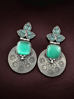 The oxidized silver replica finish gives the earrings a rich antique appeal, enhancing the depth and definition of the intricate flower design. Carefully set stones add a subtle sparkle that perfectly balances the vintage look, creating an eye-catching yet elegant piece. The unique design ensures these Flower Design Dangler Earrings stand out while remaining versatile enough for various occasions.
