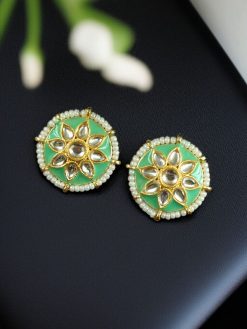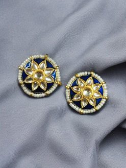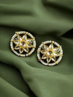 Each petal of the flower is adorned with carefully set kundan stones, offering a brilliant sparkle that catches the light with every move. Complementing the radiant stones, the earrings are enriched with unique pearl detailing, adding a soft, luxurious finish. The combination of polished stones and delicate pearls brings a harmonious balance of shine and subtlety, making these earrings truly stand out.