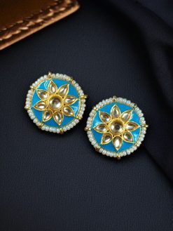 Expertly handcrafted, these earrings feature the intricate art of Kundan Meena work, a celebrated technique known for its vibrant enamel detailing and rich traditional appeal. The design highlights a beautiful flower motif, symbolizing grace, freshness, and elegance, making it a perfect addition to ethnic and festive outfits.