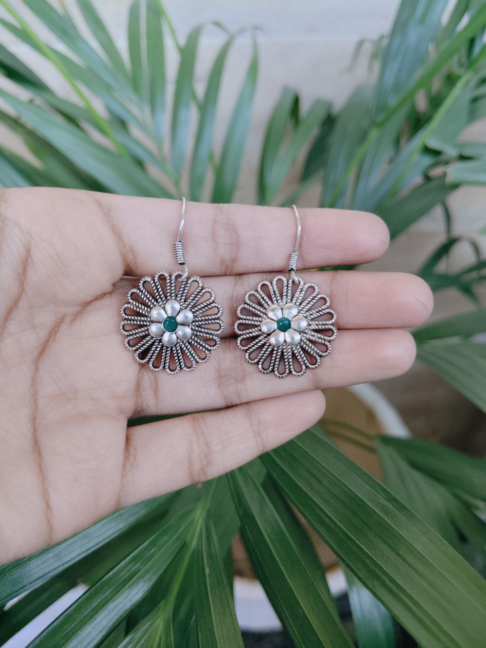 Flower Design German Silver Hook Earrings with Elegant Stone Work
