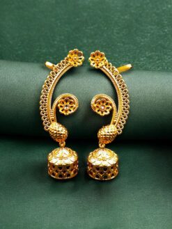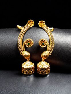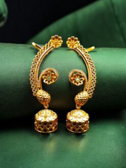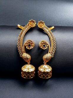 Add timeless elegance and festive charm to your jewelry collection with this Beautiful Flower Design Gold Plated Jhumka Earcuff, exquisitely crafted with detailed stone work. Inspired by classic Indian traditions, this unique earcuff-style jhumka beautifully blends floral artistry with traditional craftsmanship, making it a perfect statement accessory for ethnic wear.