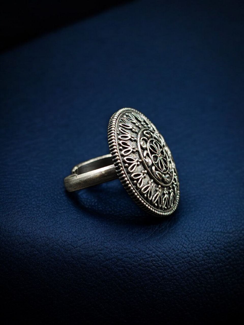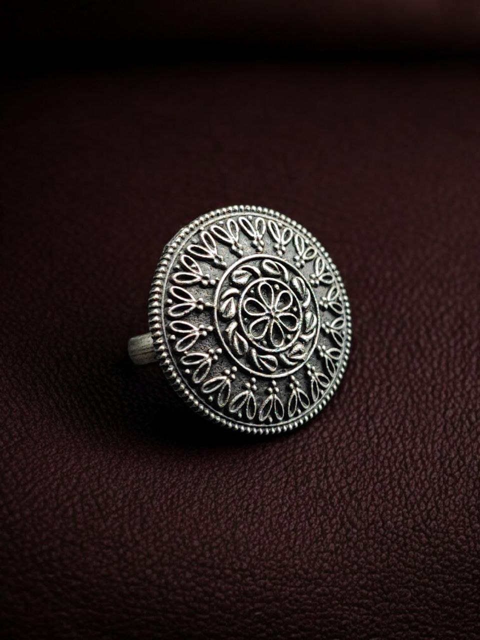 Crafted in a premium silver replica base, this ring features an oxidized finish that gives it a rich, antique-inspired appeal. The round flower design is detailed with fine craftsmanship, highlighting the petals and creating a balanced, elegant look. Its subtle yet eye-catching design makes it suitable for women who prefer minimal jewelry that still stands out.