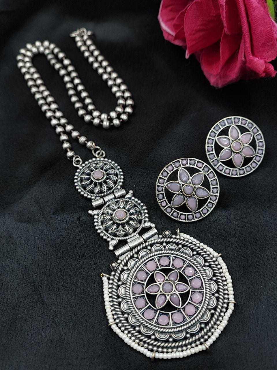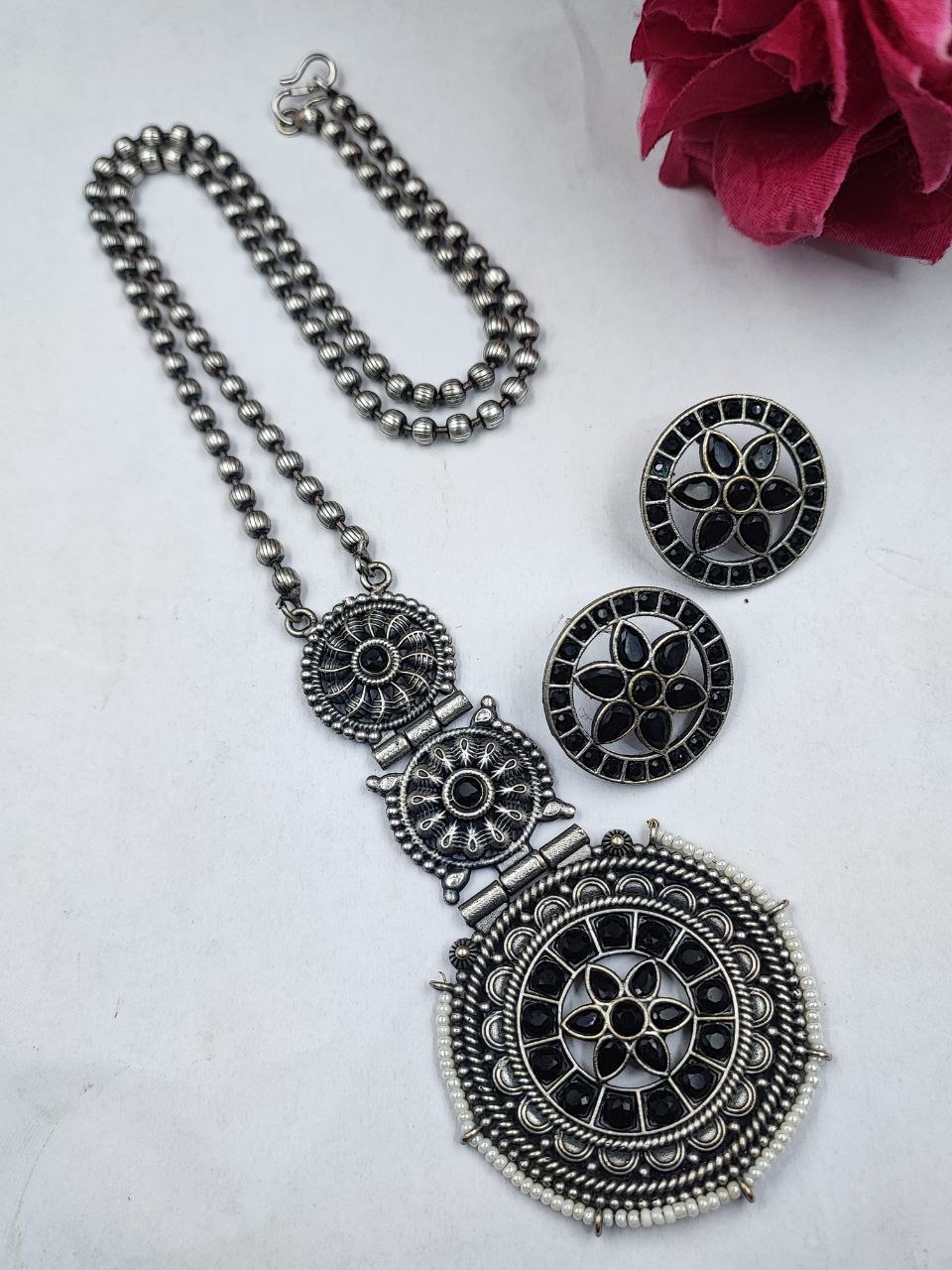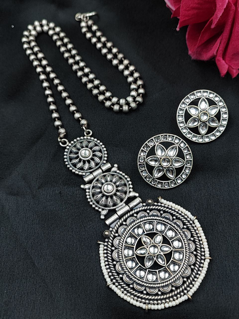 Flower design silver replica necklace set with round stud earrings, traditional antique finish ethnic jewelry set for women