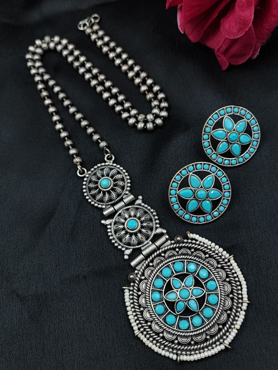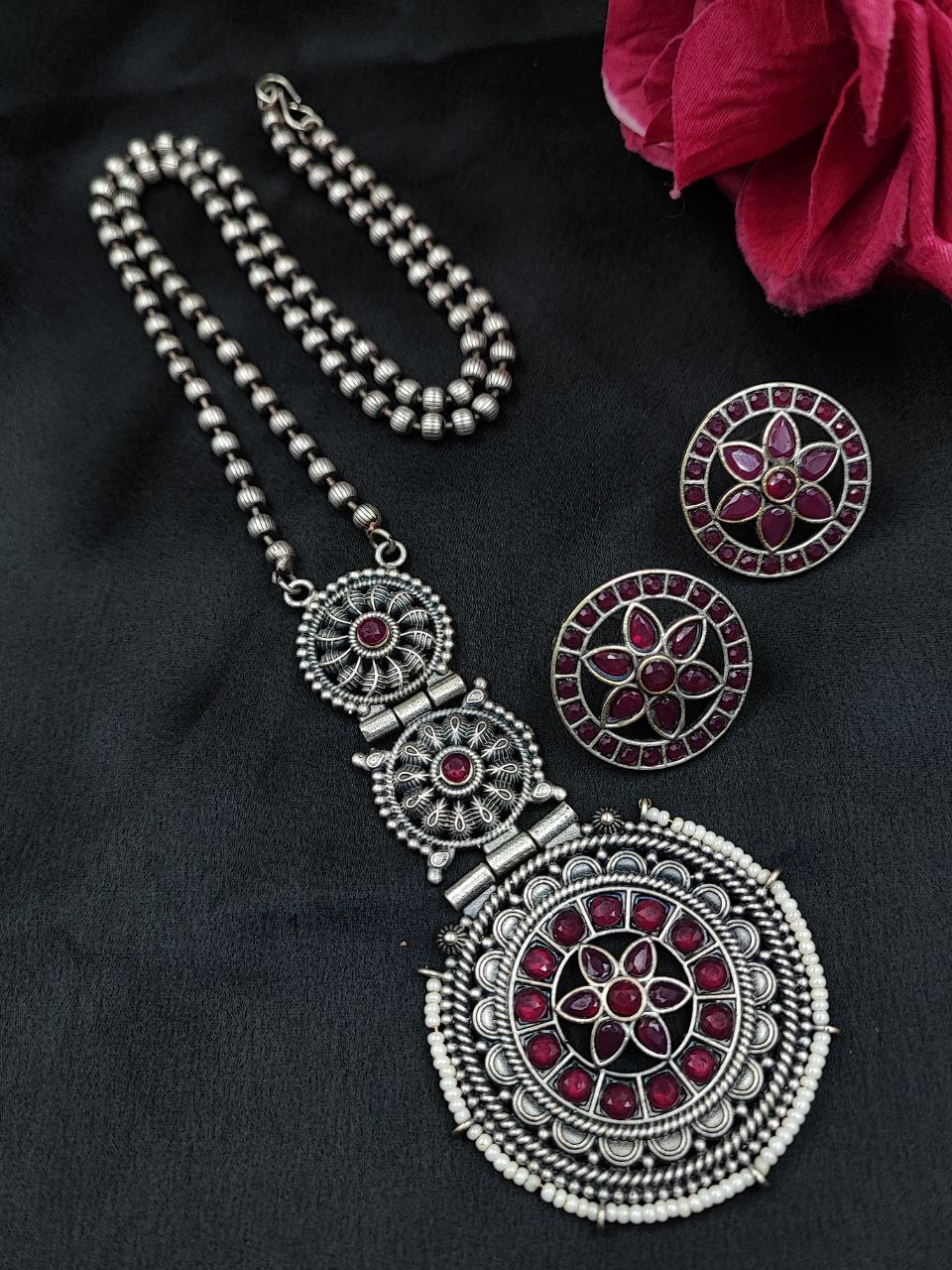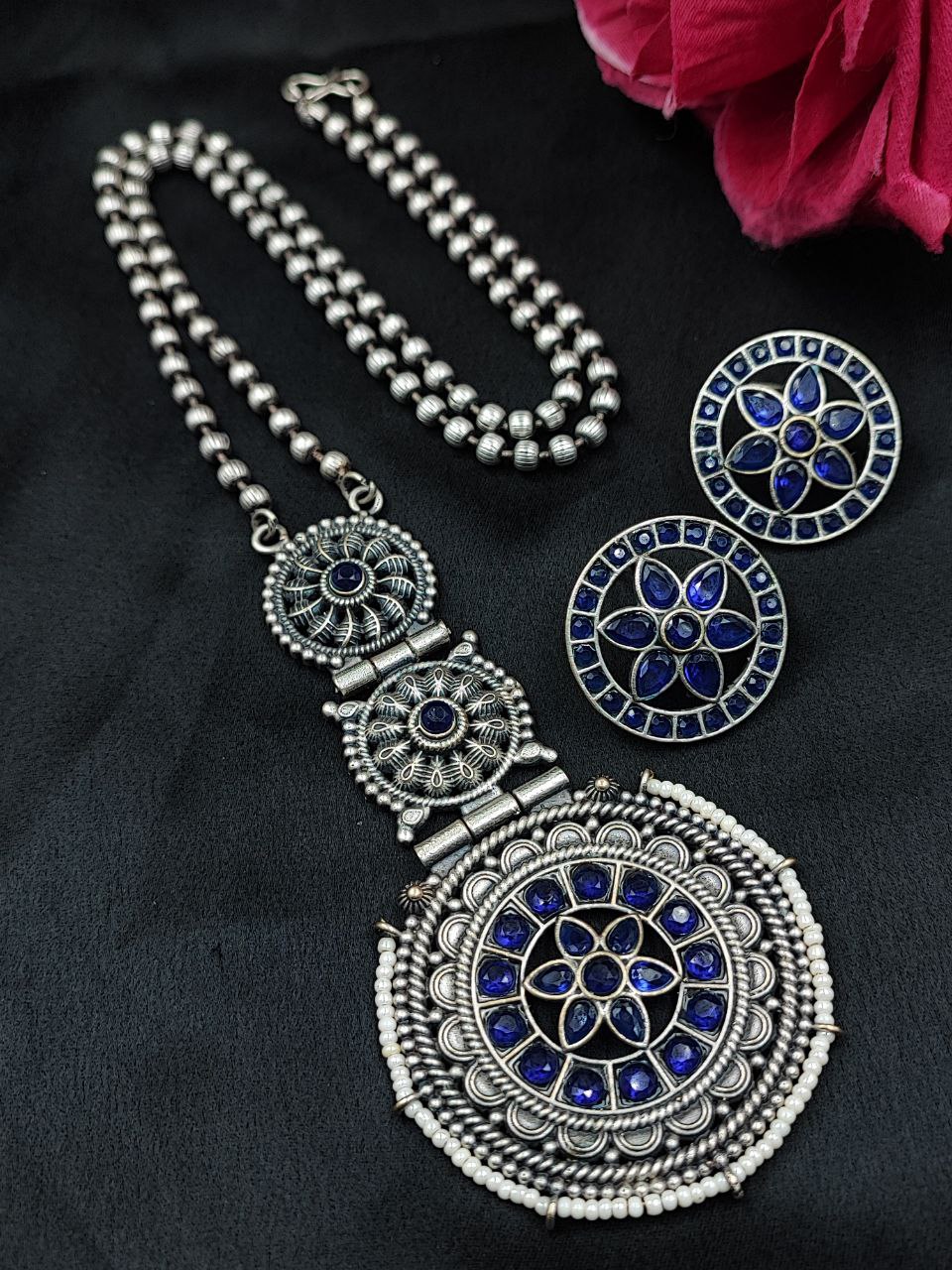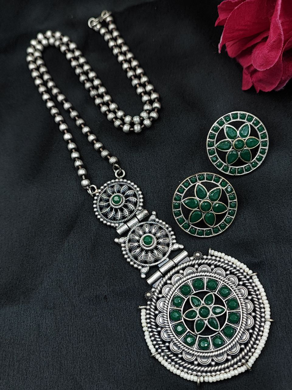 Flower design silver replica necklace set with round stud earrings, traditional antique finish ethnic jewelry set for women