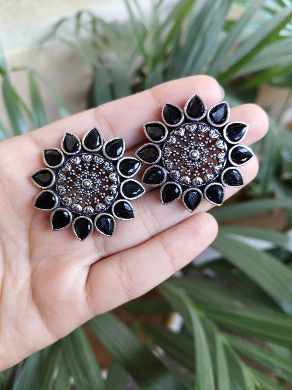 The floral motif, a symbol of beauty and femininity, adds a graceful charm to your look, while the shimmering stones provide a refined sparkle that elevates your outfit. Designed with care, these earrings are lightweight yet durable, ensuring comfort for all-day wear without compromising on style. The oxidized silver finish gives them a classic antique look, making them stand out as a statement piece.