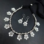 Crafted with precision and passion, each flower charm exudes a unique charisma, reflecting the meticulous artistry of skilled artisans. The intricate details of the blossoms capture the essence of nature’s beauty, creating a harmonious balance between contemporary style and classic charm. The lustrous finish of the German silver enhances the luxurious appeal of this Flower Charms German Silver Necklace, adding a touch of opulence to your look.