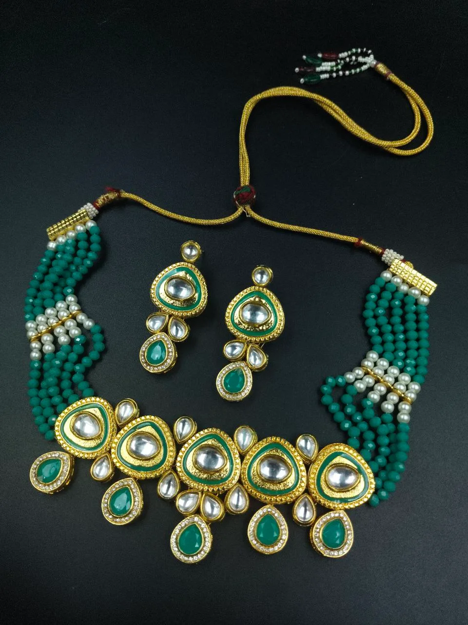 The premium quality gold plating gives this choker a luxurious finish, while the intricately arranged Kundan stones add a sparkling charm that captures attention effortlessly. The craftsmanship reflects traditional Indian jewelry aesthetics, making it a must-have ethnic jewelry piece for every girl’s collection.