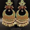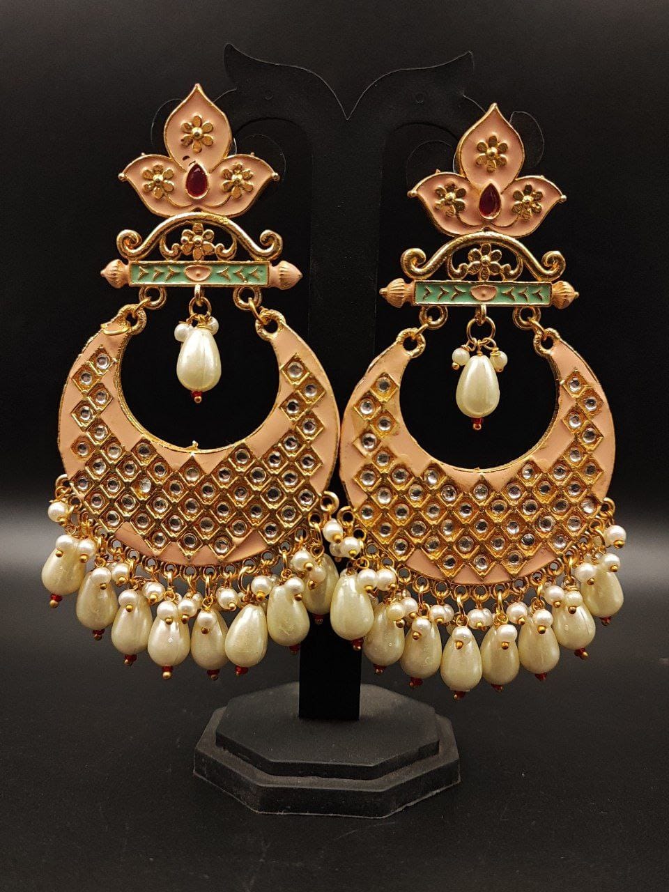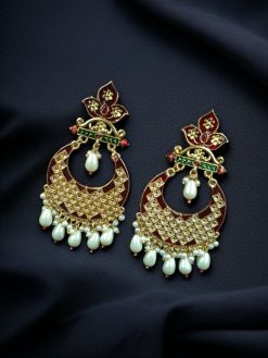The crescent-shaped dangler, or chandbali, is adorned with lotus motifs and finished with tiny pearls that enhance the overall charm of the piece. The long dangler style gives these earrings a royal flair while ensuring that they catch the light with every movement. Whether paired with a lehenga, saree, or anarkali, these designer chandbali earrings will instantly elevate your ethnic outfit.