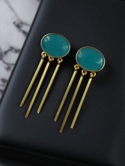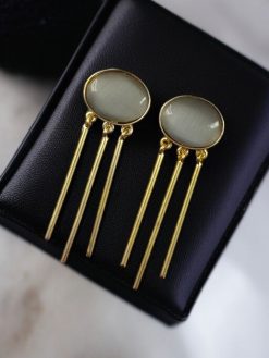 Crafted with a lustrous gold-plated finish, the earrings exude sophistication while maintaining a lightweight feel that makes them comfortable for all-day wear. The highlight of this stunning pair is the Monalisa stone—renowned for its luminous sheen and translucent beauty. Its soft, glowing appearance adds a luxurious touch, enhancing the elegance of any ensemble.