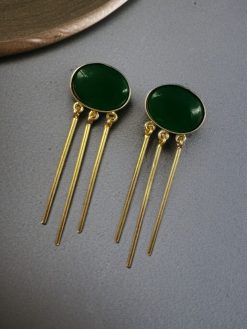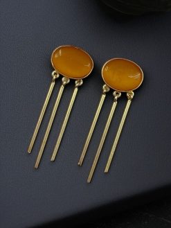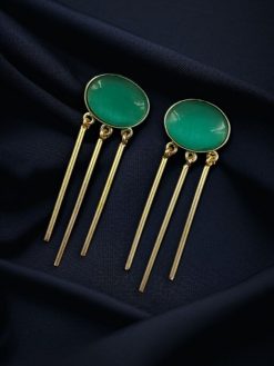 Step into any occasion with confidence and charm by wearing these Elegant Golden Dangler Earrings with Monalisa Stone—your go-to accessory for effortless sophistication.