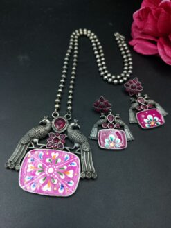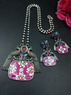 The silver-plated finish gives this Hand Painted Peacock Necklace a premium oxidized look that replicates antique silver without the high price tag. Lightweight yet durable, this necklace sits comfortably on the neckline, and the matching earrings complete the regal look with elegance. Ideal for festivals, weddings, poojas, or traditional gatherings, this set ensures you make a bold yet classy style statement.