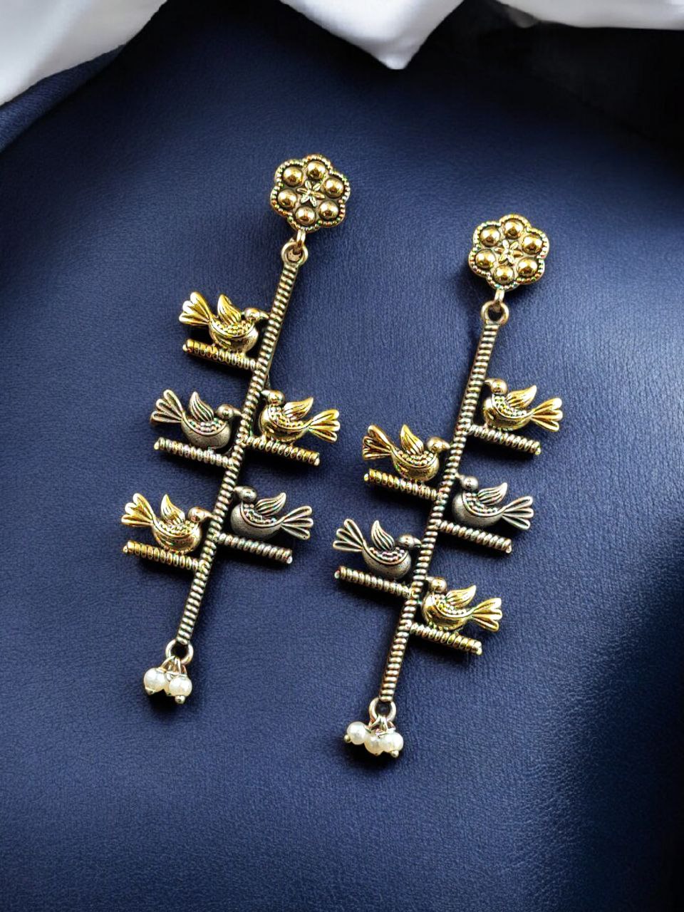 The earrings feature a graceful bird motif, symbolizing freedom, beauty, and positivity. The bird design is enhanced with a sophisticated two-tone finish, blending contrasting metallic shades to add depth and character. The delicate pearl detailing brings a soft, feminine touch, balancing the bold design with elegance.