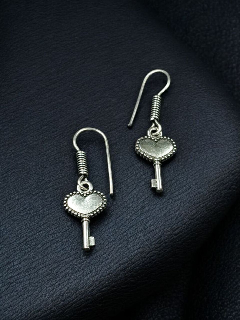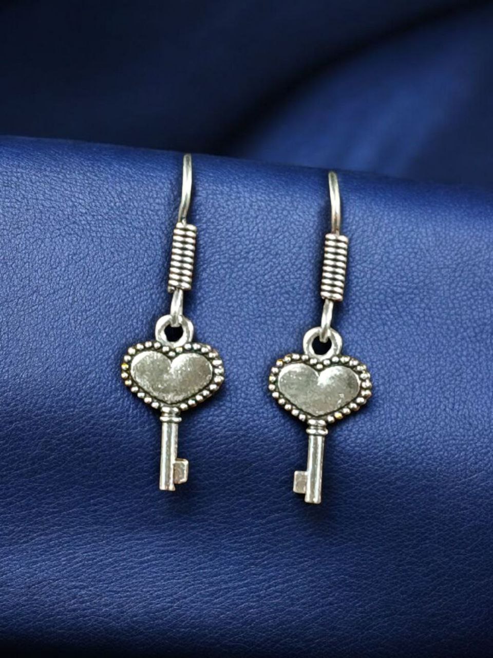 Each pair is meticulously handmade by skilled artisans, showcasing intricate oxidized detailing that gives the earrings a rich antique finish. The heart and key charm hangs gracefully from a sturdy hook design, ensuring comfort and ease of wear throughout the day. The fine German silver material gives these earrings a polished yet rustic look, making them lightweight, durable, and perfect for daily wear.
