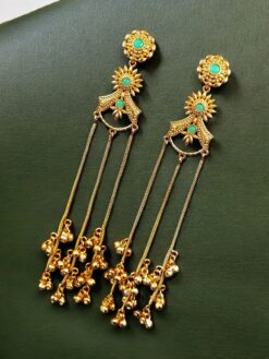Crafted with precision, these Kashmiri Earrings feature premium-quality gold plating that offers a luxurious shine while ensuring durability and long-lasting wear. The detailed stone work reflects traditional Kashmiri craftsmanship, showcasing fine patterns and artistic detailing that make each piece truly special. The beautifully arranged stones catch the light effortlessly, adding a subtle sparkle that elevates your overall appearance.
