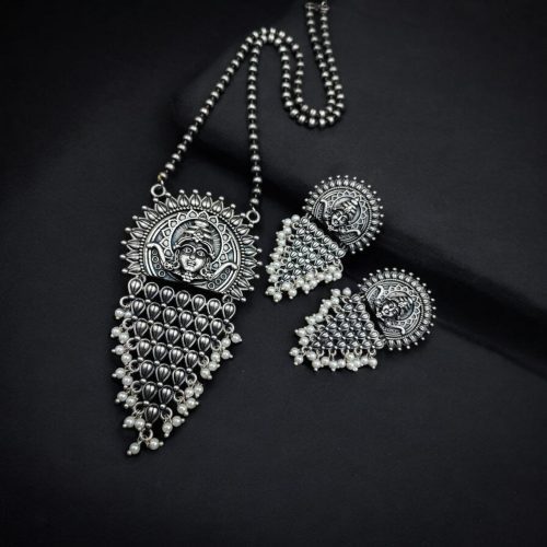 This pendant set is a masterpiece, meticulously handcrafted by skilled artisans who have infused their devotion and craftsmanship into every detail. Made from high-quality silver alloy, this necklace offers the look and feel of pure silver without the hefty price tag. The pendant features an intricately carved image of Goddess Durga, complete with her serene yet powerful expression, her multiple arms holding various weapons, and her majestic lion mount. The fine detailing highlights the goddess’s ornate crown and flowing robes, symbolizing her divine beauty and strength.