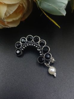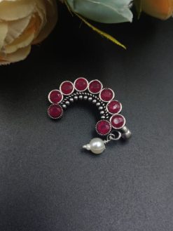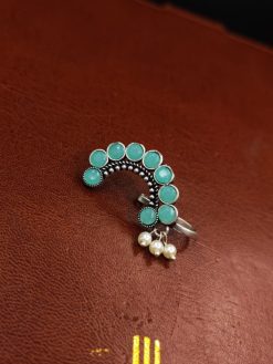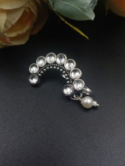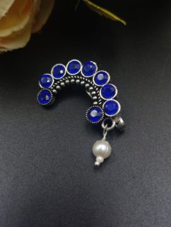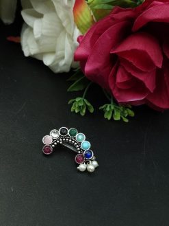 The oxidised silver plating lends it a rustic charm, evoking a sense of nostalgia for bygone eras, while the delicate stone work adds a touch of sophistication and glamour. Whether you’re dressing up for a traditional wedding, a cultural festival, or simply embracing your roots in everyday wear, this nosepin effortlessly complements your ensemble with its timeless appeal.