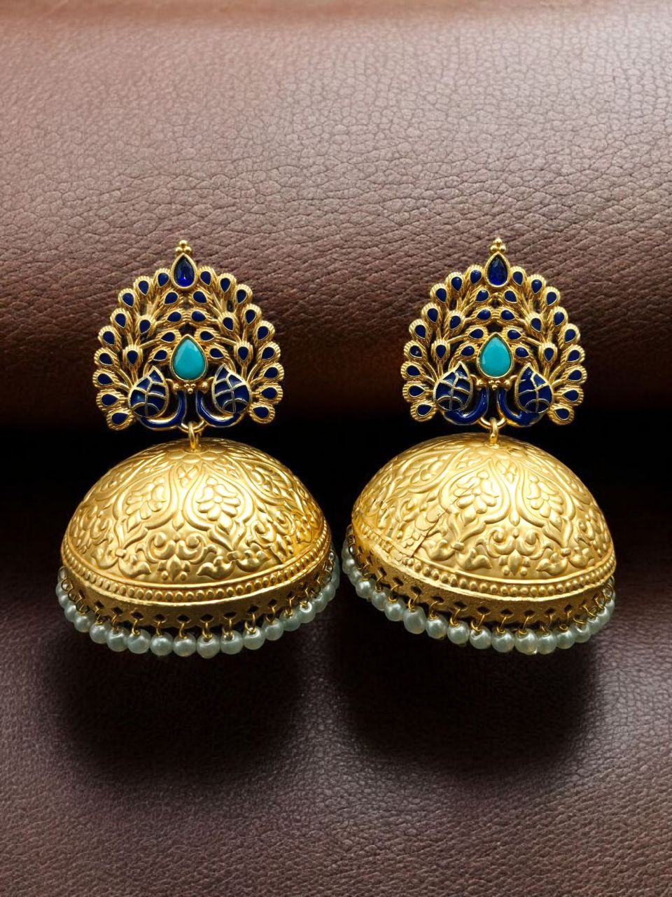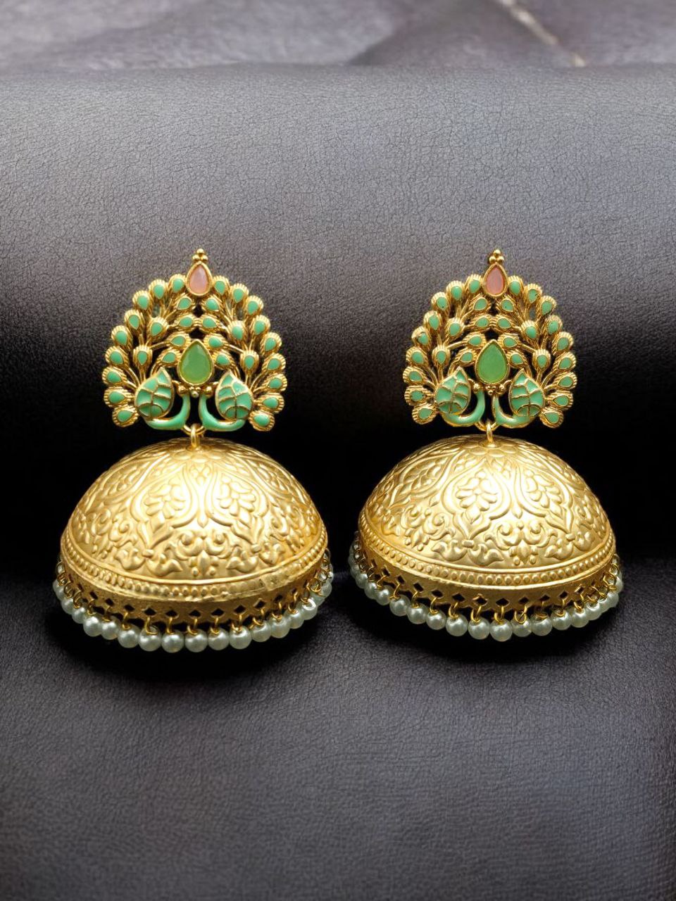 Experience the royal charm of traditional Indian craftsmanship with these Elegant Meenakari Peacock Jhumka Earrings, designed to radiate beauty, grace, and timeless elegance. Crafted with exquisite detail and finished in rich gold plating, these Meenakari Peacock Jhumka Earrings are a perfect reflection of ethnic sophistication. The stunning peacock motif, combined with delicate Meenakari enamel work, creates an artistic masterpiece that celebrates the grandeur of Indian jewelry heritage.