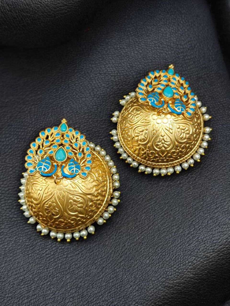The intricate Meenakari enamel detailing adds a vibrant touch of artistry to the earrings, showcasing the rich traditional craft of Rajasthan and Banaras jewelry-making. The lustrous gold plated finish gives them a regal glow, while the pearls at the edge enhance their feminine elegance. These Meenakari Peacock Jhumka Earrings pair beautifully with sarees, lehengas, or festive kurtis, elevating your entire ethnic look.