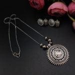 The necklace features a delicate chain made of oxidized German silver, known for its antique appearance and durability. The chain is adorned with intricately designed motifs and beads, adding a captivating allure to the piece. It sits gracefully around your neck, enhancing your neckline and making a bold style statement.