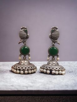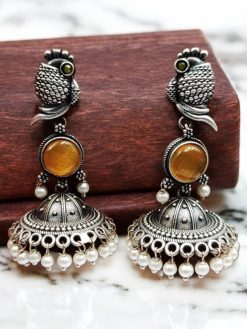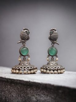 Elevate your jewelry collection with our exquisite Oxidised Jhumka Earrings, a perfect blend of traditional artistry and contemporary elegance. These silver-look-like jhumkis, adorned with intricate stone work, are designed to make you stand out on any occasion, adding a touch of timeless charm and sophistication to your ensemble.