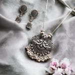 This jewelry set is designed to be versatile, suitable for various occasions and attire. Whether attending a formal event, a festive celebration, or a casual outing, the Oxidised Peacock Chain Necklace with Jhumka Earrings effortlessly enhances your ensemble with its timeless beauty. Pair it with a traditional saree for a classic look or wear it with a contemporary outfit to add a touch of ethnic flair.