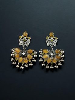 Crafted with premium-quality materials, these Silver Look-Alike Earrings feature a durable oxidized finish, giving them an antique-inspired aesthetic that complements both ethnic and modern attire. Each Stone Earrings showcases a finely carved peacock motif, adorned with shimmering stones that add a subtle sparkle and elevate the overall design. The combination of oxidized silver and vibrant stone detailing creates a captivating contrast, ideal for enhancing your outfits with a touch of ethnic sophistication.